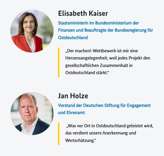 Der Ideenwettbewerb für Ostdeutschland geht 2026 in die siebte Runde. Umgesetzt wird er von Elisabeth Kaiser, der Ostbeauftragten der Bundesregierung, seit 2023 in Kooperation mit der Deutschen Stiftung für Engagement und Ehrenamt.